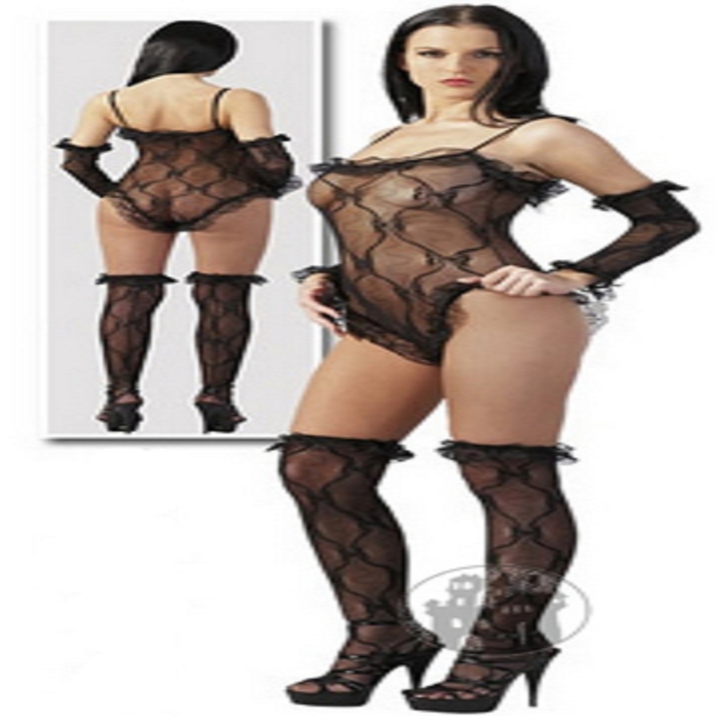 Body Set schwarz - Body, Armstulpen und Strümpfe. Weiche Effekt-Spitze mit Rüschen. Schwarz.