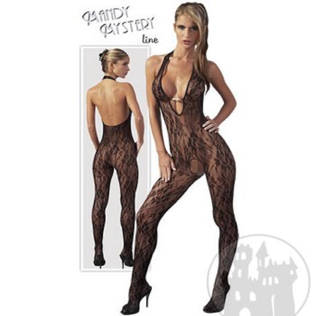 Catsuit Pearl - Verführerischer schwarzer Spitzen-Catsuit mit Neckholder und drei Perlen am Dekolté, es wird durch einen sehr tiefen Ausschnitt wundervoll betont. Dank des offenen Schritt sind Sie für jedes erotische Abenteuer bereit. Mit Fuß.