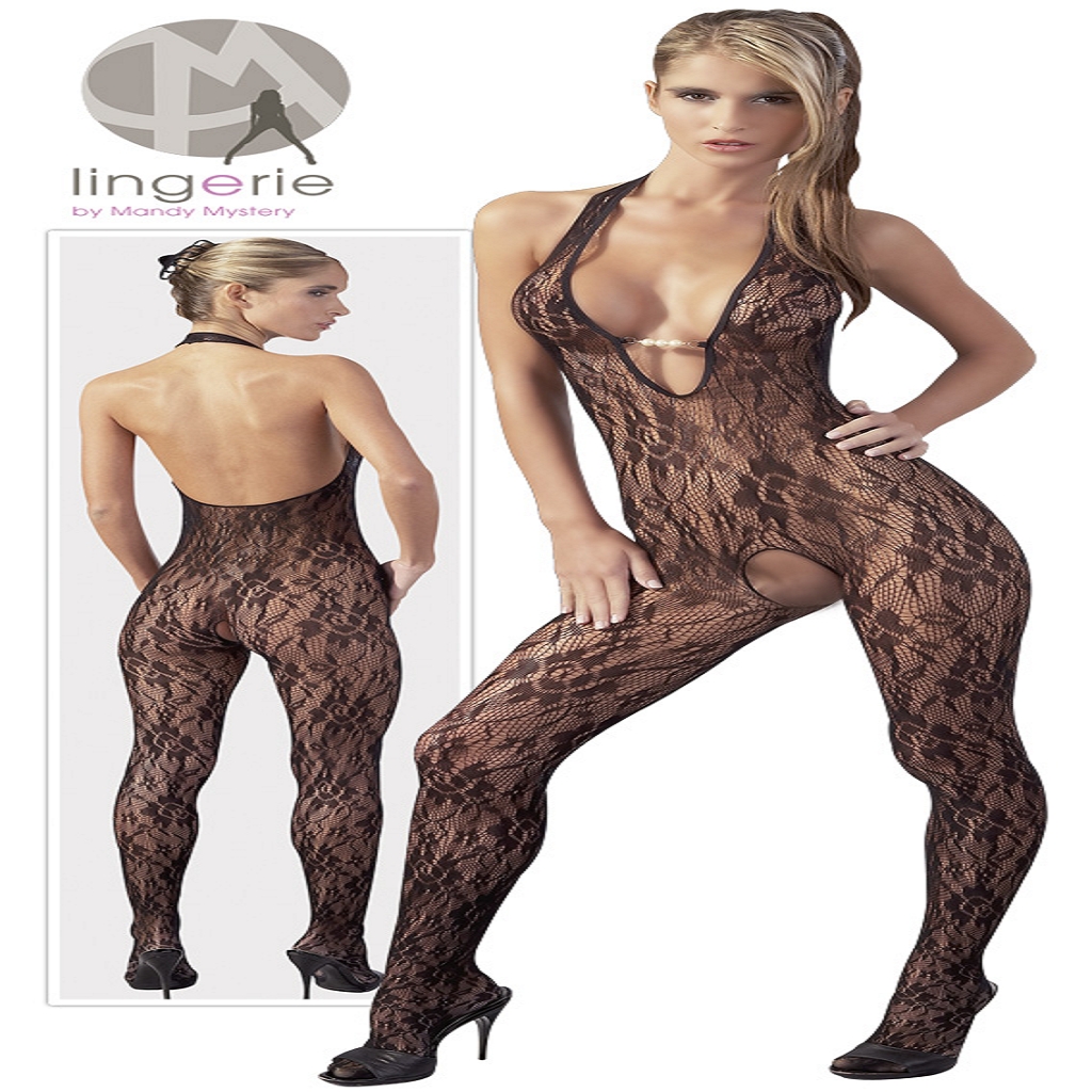 Schwarzer Catsuit aus filigran gearbeitetem Netz, mit Neckholder und drei Perlen am Dekolleté. Im Schritt offen. Mit Fuß.