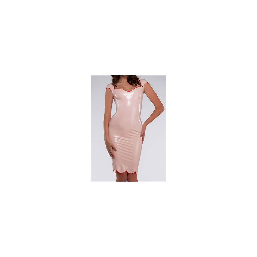 Knielanges Latex Vintage-Kleid - Dieses handgemachte Kleid besteht aus einem angenehmen Latex-Material, dass sich angenehm dem Körper anschmiegt und Ihre Kurven betont. Es ist enganliegend und vom Schnitt her Vintage-inspirieriert. Am Dekolleté in Herzform, am unteren Muschelsaum und an den kurzen Ärmelchen befindet sich eine Naht in Kontrastfarben in Rot.