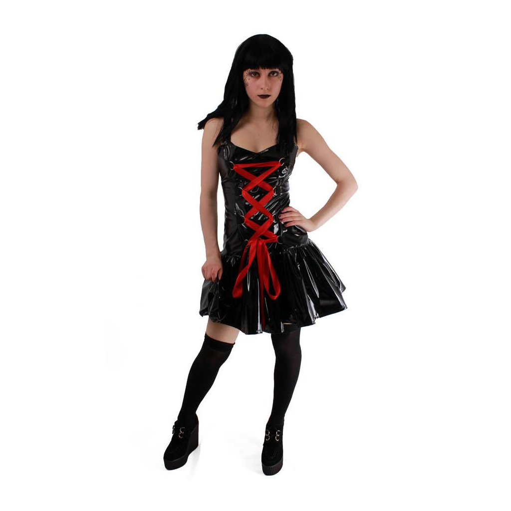 Lackminikleid mit Corsettschnürung - Sexy, enganliegenes Latexkleid aus glänzendem PVC Material mit ausgestelltem, kurzen Rock. Vorne befindet sich eine auffällige, rote Korsettschnürung. Lässt sich mit einem langen Reißverschluss an der Rückseite öffnen und schließen. Wenn sie süß und verführerisch gleichzeitig wirken wollen, ist dieses verspielte Kleid genau das Richtige für Sie.